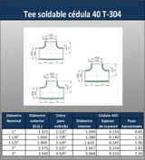 Tee Soldable Cédula 40 T304 marca DLaT. Es una tee que sirve para distribuir la línea de producción, en ambos extremos es soldable según medida. El grosor de la pared es de cédula 40. Recomendado para la industria alimenticia e industrial. Producto de China. Cuenta con certificado de calidad tanto de procedencia como nacional. Cumple con las normas sanitarias AMSI y A3. Se añade ficha técnica